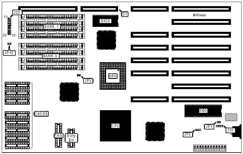 Note:The cache, TAG, and dirty bit chip locations and sizes are unidentified. | |||