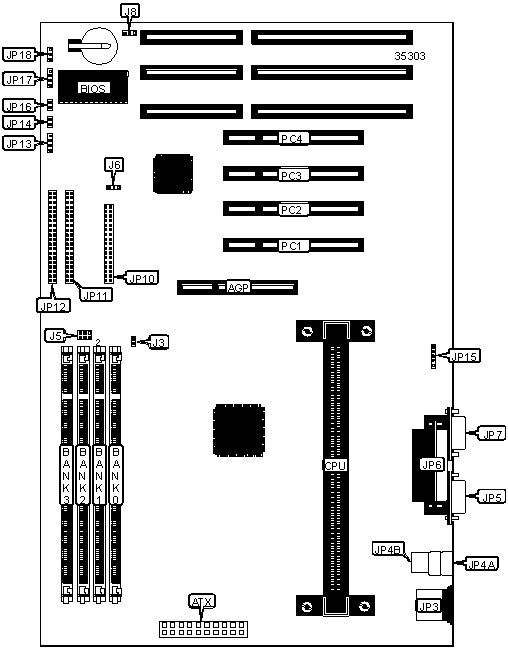 32-bit PCI slots (4), floppy drive interface, IDE interfaceS (2), parallel port, PS/2 mouse port, serial ports (2), IR connector, USB connectors (2), AGP slot, ATX power connector